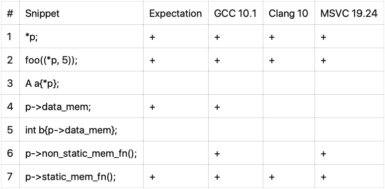 p->static_mem_fn();As we mentioned in description to example 1, CWG says that this example is a valid code. The only thing to add is that indirection through expression to the left of -> is performed even when its result is not required (foontnote 59).