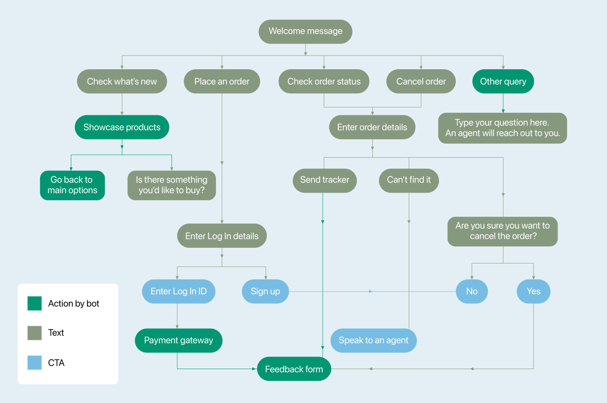 A chatbot responds to a client according to the script. It doesn't know how to improvise and rearrange communication if something doesn't go according to plan. That's why it's essential to think out a clear, consistent, and logical communication script for the chatbot: