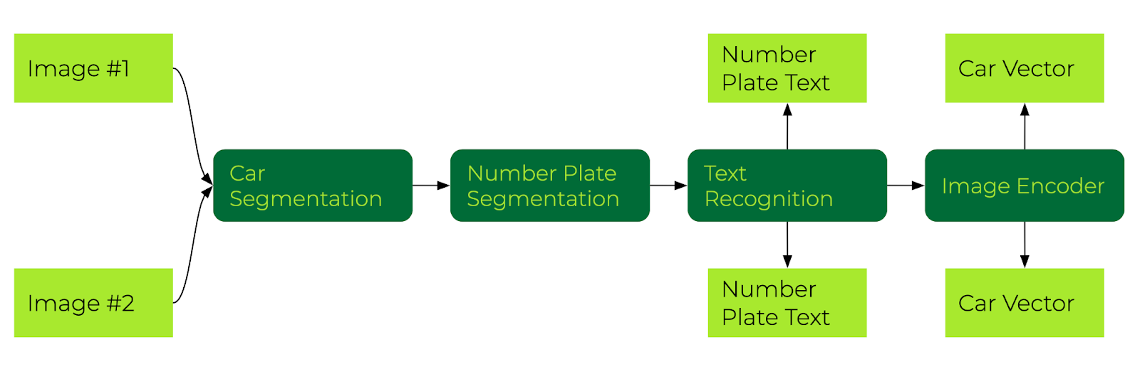 The E2E model implies involving one large model (most likely a neural network) that can answer our questions based on a pair of images, such as “Is it the same vehicle in the photo or not?”, “Do the license plate numbers match up or not?”, etc.