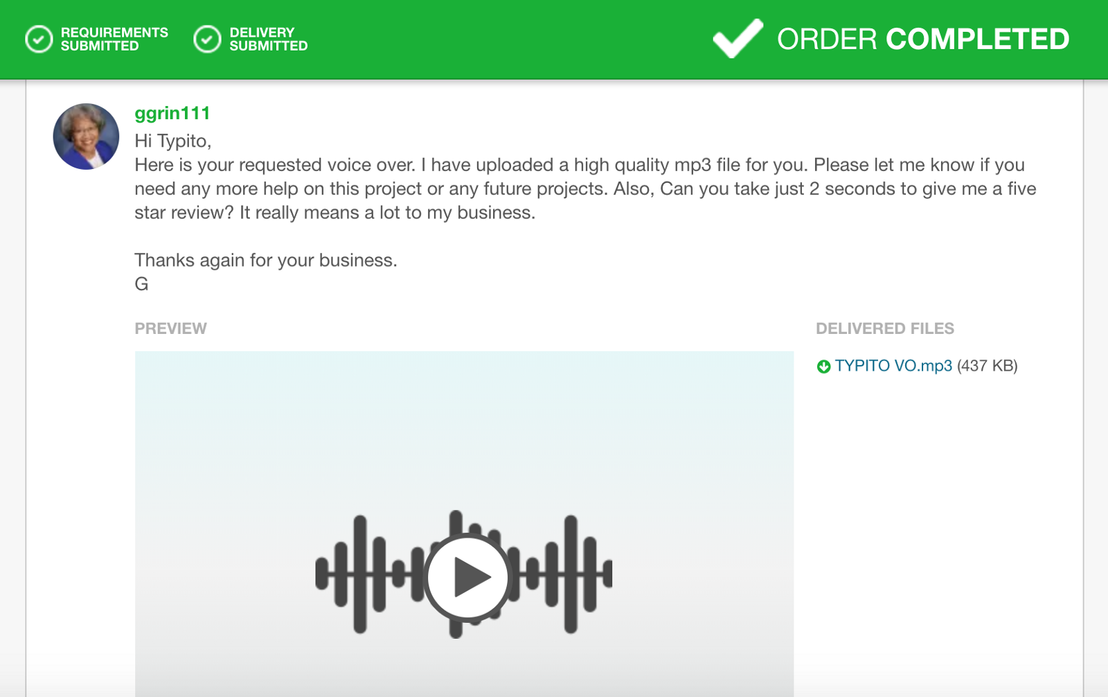 ggrin111 (voice over artist for food blogger) and other artists on Fiverr did a great job.