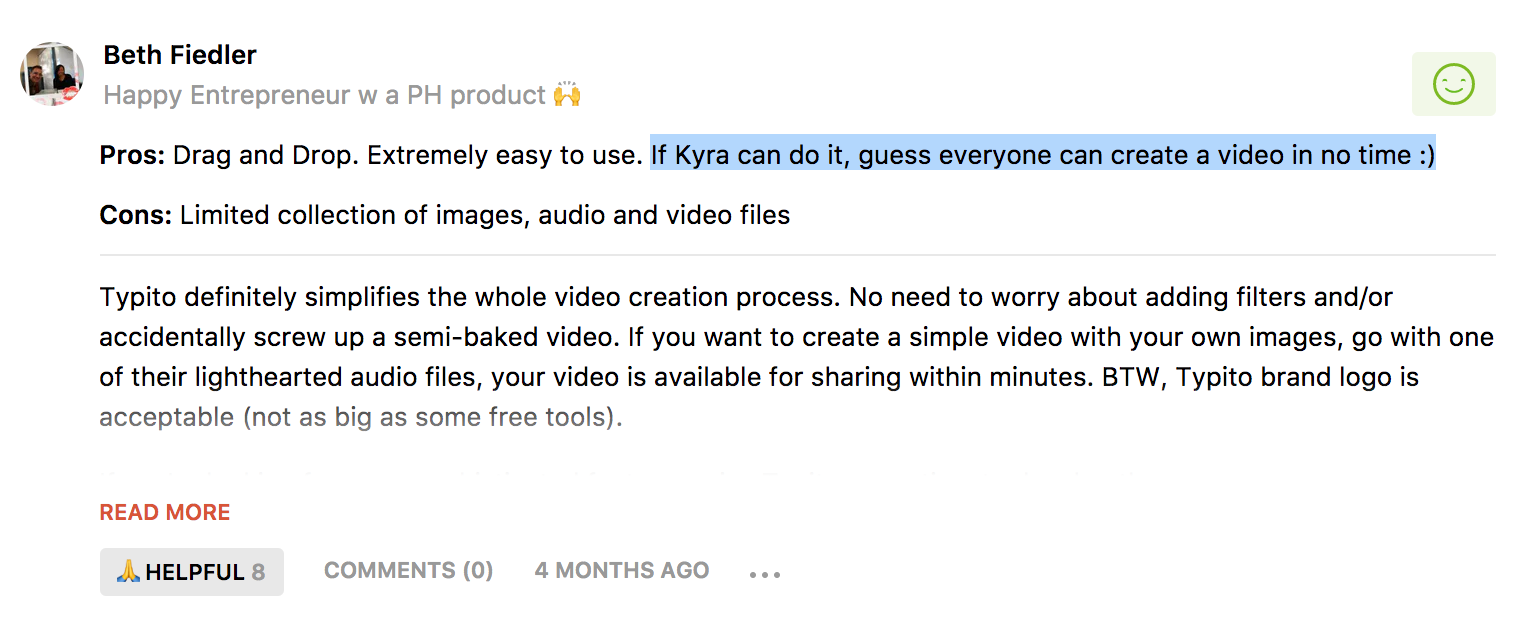 2/ Here’s Beth Fiedler a Product Hunt user referring to one of the customer stories in the explainer video in a comment about Typito. For us, this is a sign of brand recall and evidence of a story that sunk in deep enough to make a difference.