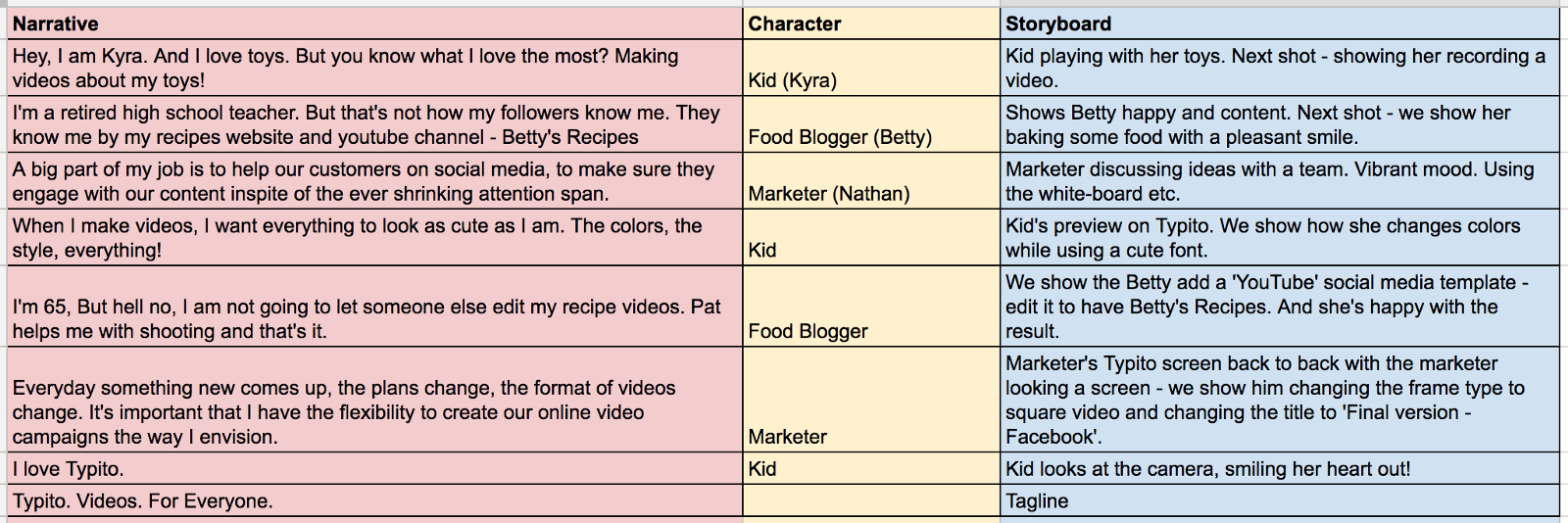 Every video starts with a script. Then comes the storyboard which then acts as the guideline for your video production efforts. If you have a great script and storyboard I’d say your job is half done (I’m obviously exaggerating). We checked out different tag-lines for our script — ‘Power of Videos’, ‘Videos for Business’ etc. What finally stuck among the spaghetti on the wall was ‘Videos for Everyone’ and that was based on our mission to make Typito the easiest tool to produce videos online — something that’s built for everyone. And to back it up, we did have customers who were 7 year olds to 70 year olds. Next step — we drafted a script built on first person narrative based on 3 actual users of Typito and did a textual storyboard version of the script. We were making progress!