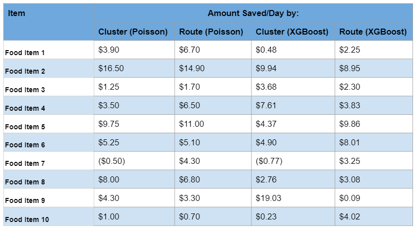 We realized that by setting the optimal service level at 0.68, our model was able to save ~$70 compared to GU’s model for a single food item per route per 10 days. But we wanted to go further. So we ran the model for the top 10 most bought food items across both routes and clusters, and got this handy table shown below: