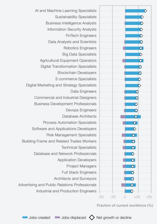 This table clearly shows that the fastest-growing roles are driven by technology, digitalization, and sustainability. Renewable Energy engineers and Solar Energy engineers are also becoming highly demandable as many industries are shifting towards renewable energy. It's worth noting that the fastest-declining roles are also driven by technology and digitalization. Automation is going to gradually substitute Secretarial roles, Clerks, and Cashiers. To be more precise, the report shows that such roles as such as Data Analysts and Scientists, Big Data Specialists, Business Intelligence Analysts, Database and Network Professionals, and Data Engineers will undergo a 30-35% increase (1.4 million jobs) due to the integration of frontier technologies which rely on big data. Demand for AI and ML specialists is expected to grow by 40% (1 million jobs) as the utilization of AI and ML continues to be the critical factor of industry transformation. We can also expect a 31% increase in demand for Information-Security Analysts, resulting in 0.2 million additional jobs. It is caused by the enhanced adoption of encryption and cybersecurity because of the increasing number of cybersecurity incidents.