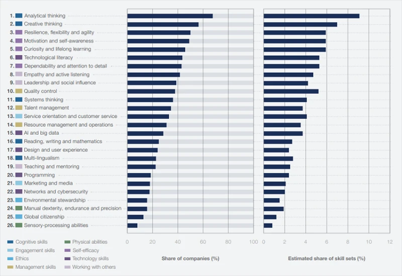 Finally, I've come to the most critical question "What skills are needed for these professions? How to stay demandable in the nearest future?". As the previous report showed, Analytical Thinking will remain the most sought-after skill required by most companies (constitutes, on average, 9% of the core skills reported by companies). Cognitive skills and creative thinking are ranked the second core skills, followed by self-efficacy skills, including resilience, flexibility, and agility. Though management skills, engagement skills, and technology skills are considered less important than self-efficacy, they will still play a critical role in the future.