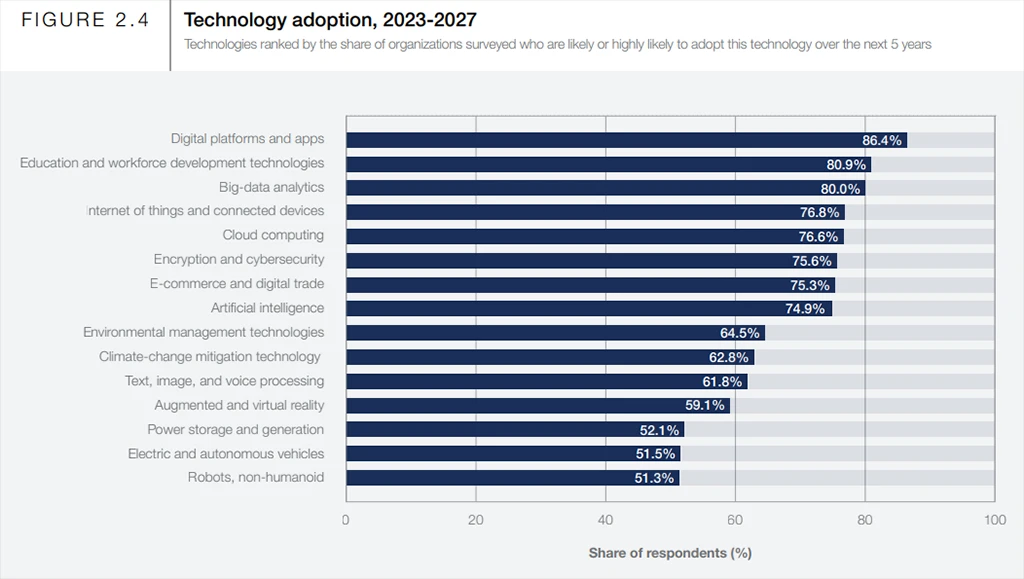 Right off the bat, I'd like to start with the influence of macro trends and technology trends on jobs and skills in the nearest future. The survey shows that more and more businesses are expected to adopt new and frontier technologies and broaden their digital access. These are the two main trends during the next five years in over 85% of the organizations surveyed.