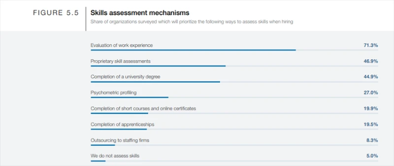 It's always economically beneficial for companies to hire a specialist who already has the needed skillset. But how to access that skillset? In 2023-2027, companies will continue to evaluate work experience the most when hiring new workers. Positively, more companies now report that they will use skill assessments (47%) rather than pay attention to university degrees (45%) to select candidates. Furthermore, almost 20% of surveyed companies will willingly hire employees who have completed short courses or obtained online certificates.