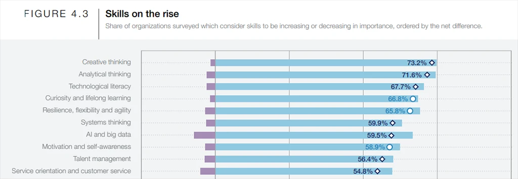 Speaking about business expectations, it's worth noting that cognitive skills also top the list of "Skills on the rise." Companies will seek employees who can solve complex problems in the workplace effectively. Surveyed businesses also report that creative thinking will also grow in importance slightly faster than analytical thinking. By the way, technology literacy is the third-fastest growing core skill. Systems thinking, AI and big data, talent management, and service orientation complete the top 10.
