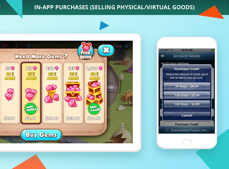 In-app purchases are exactly what they sound like. In a nutshell, this app monetization strategy involves selling physical or virtual goods within your app, and then retaining the profits. In-app purchases can include a wide variety of consumer goods such as clothes and accessories.
