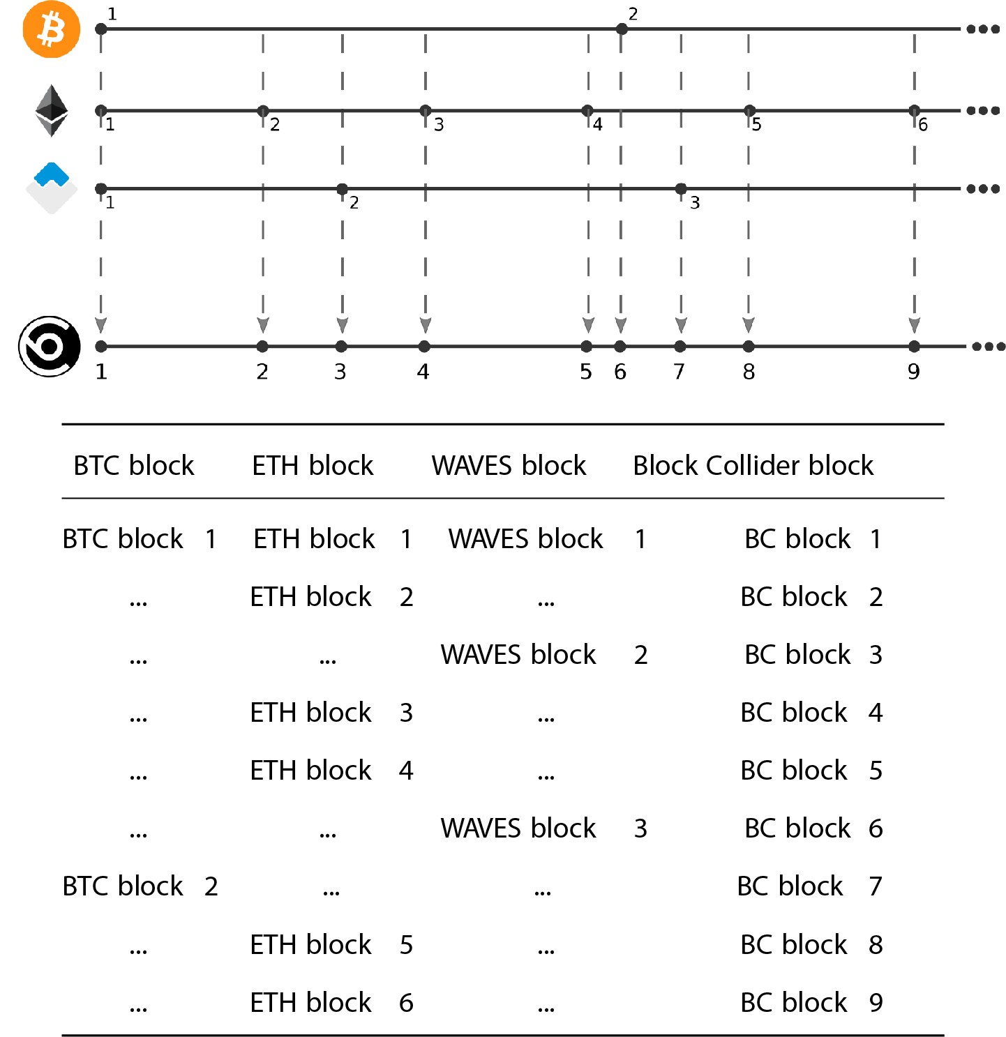 In the above example from the whitepaper we see that Bitcoin issues 2 blocks in a set time frame “x”, Ethereum issues 6 blocks and Waves issues 3 Blocks. The first Block Collider block is formed when the 3 chains issue their first block. It should be noted that block times vary across chains and as such member chains will issue blocks at different intervals. At each issuance from a member chain Block Collider will issue its own block containing the new set of blocks from the member chains. In this example 9 Block Collider blocks are issued in the time frame “x”. So the block issuance rate (block velocity) will always be higher than the fastest member chain.