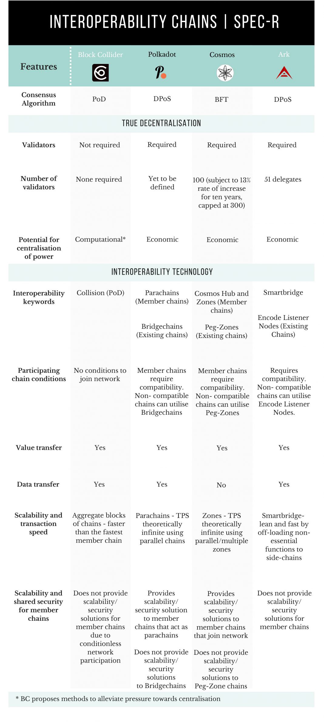 However, it should be noted though that Cosmos Polkadot, and Ark have alternate solutions to compatibility for existing chains who choose not to be modified. This can be achieved through intermediate zones, peg-zones, bridgechains, smart bridges and encoded listeners. If we are to borrow from the Polkadot whitepaper certain chains (Ethereum) are clearly easier to adapt into intermediate zones but others not so much (Bitcoin):