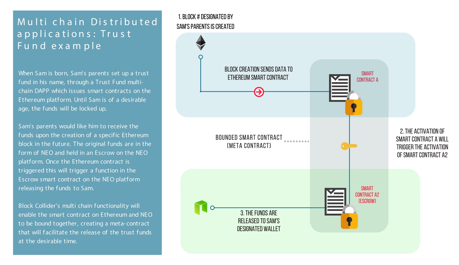 The above diagram illustrates a simple example of a distributed multi-chain DAPP handling trust funds. This kind of application only scratches the surface of the true potential Block Collider brings to the blockchain ecosystem. The multi-chain functionality is not merely transferring data but proving data relative to another chain.