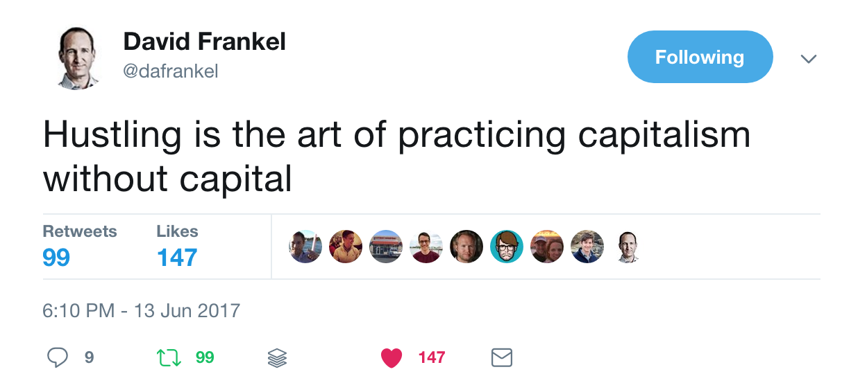 David Frankel relayed this quote from Regie Gibson, which was delivered at Cue Ball Capital’s annual gathering, as a reminder that capital is a constraint — though probably not the biggest constraint facing most startups. Hustle tends to be in much shorter supply. Here are a few inspiring stories of entrepreneurs illustrating the power of hustle over capital: