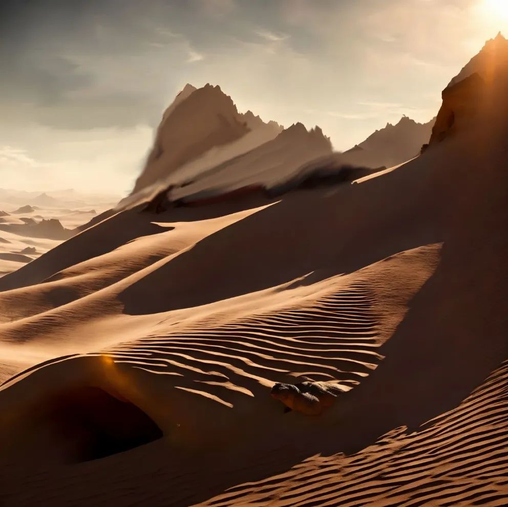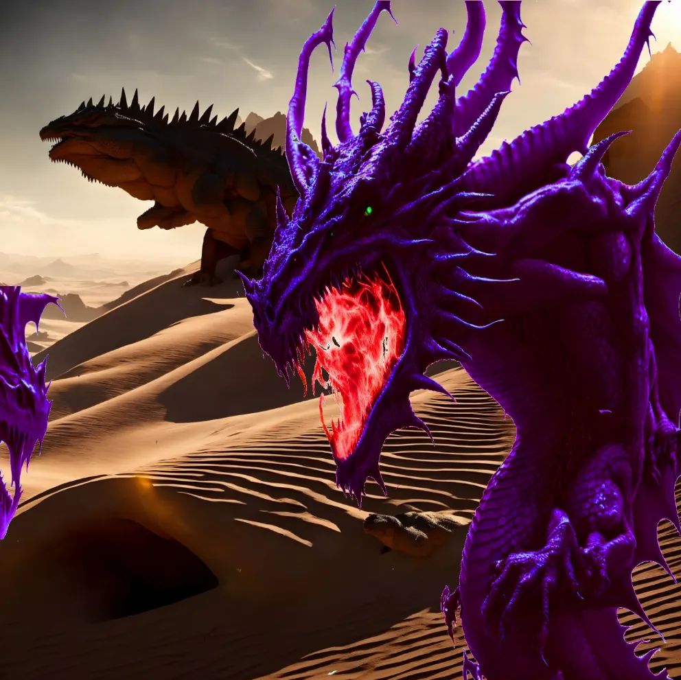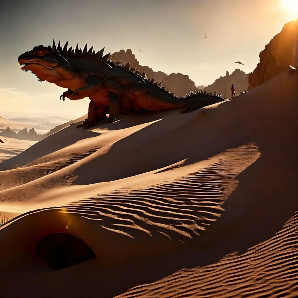 "We came up over some dunes, and suddenly this huge sand dragon crested over a dune before us. Heevus wanted a closer look and took off up the dune."