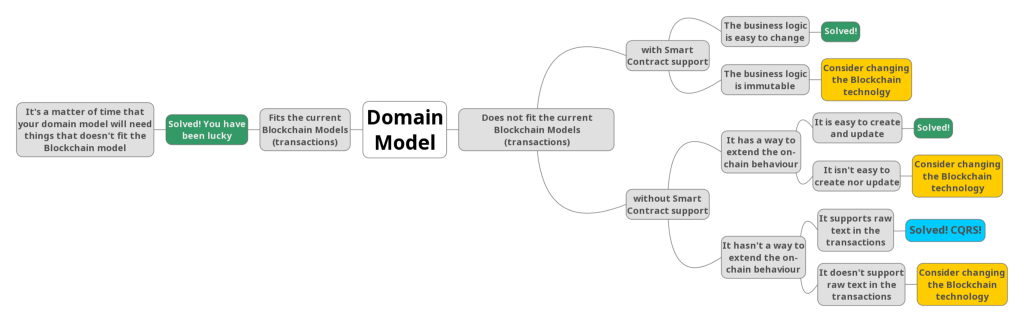 There is different ways to implement a Domain Model with Blockchain. In my humble opinion, all methods I know are too expensive and the development time too high compared to “traditional” technologies. Be sure Blockchain cost overhead is worth.