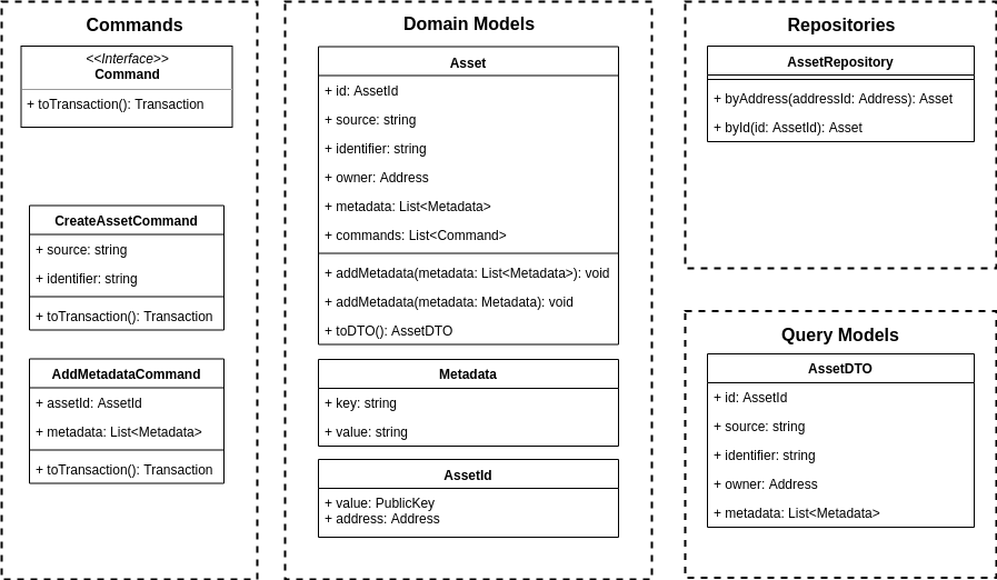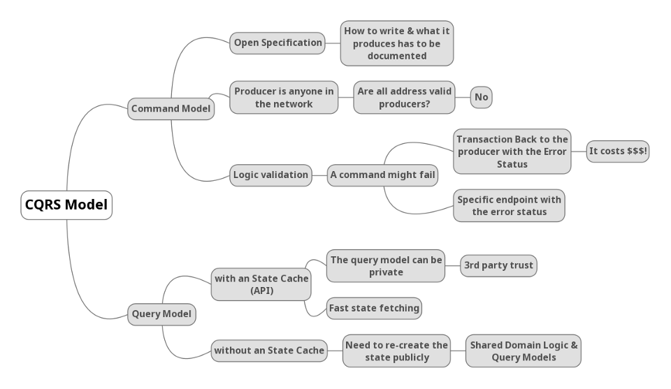 A CQRS Model helps us to define a set of Commands that we will store on the Blockchain and publish our Query Models with a public API.