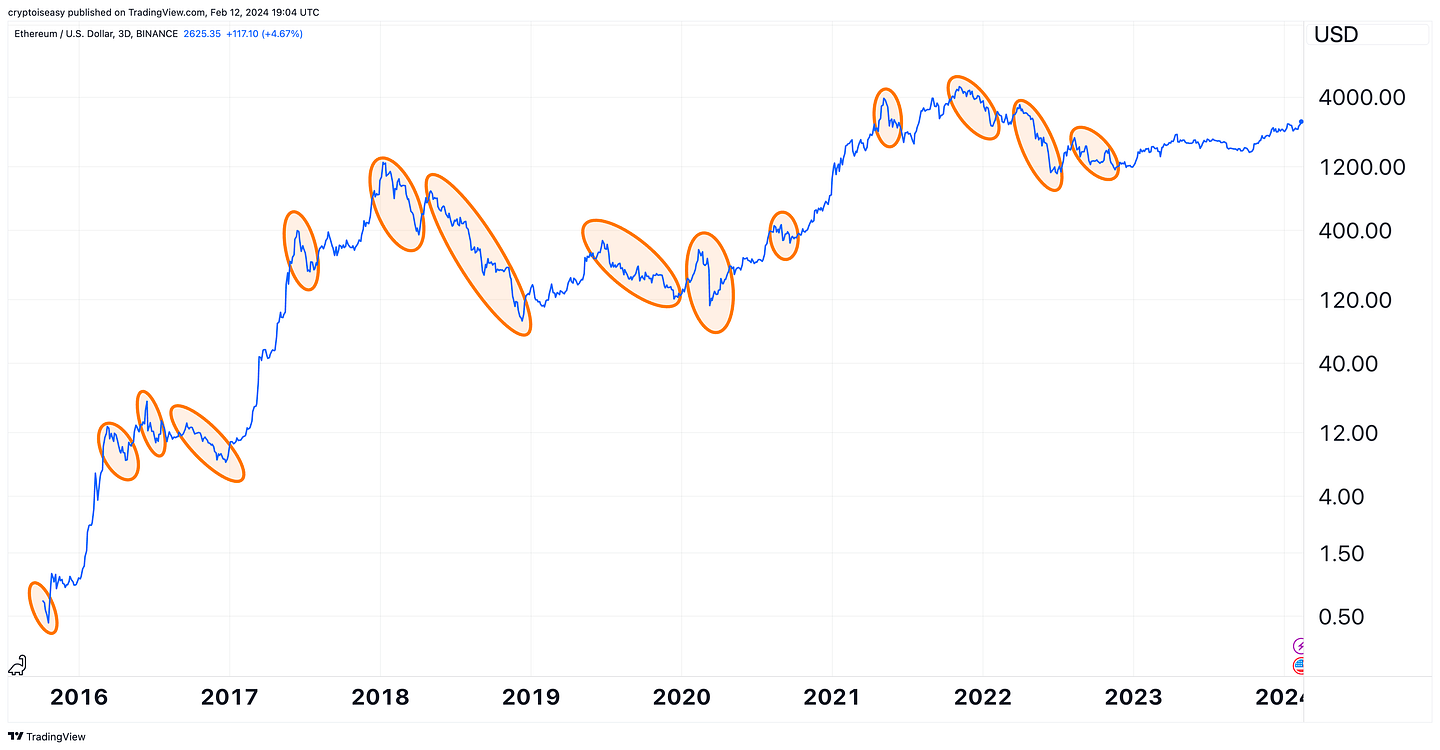 You don't even need to pull up individual altcoin charts to make this point. Look at the "safest," "least volatile" altcoin, Ethereum. It sees 50% drawdowns regularly, circled below.