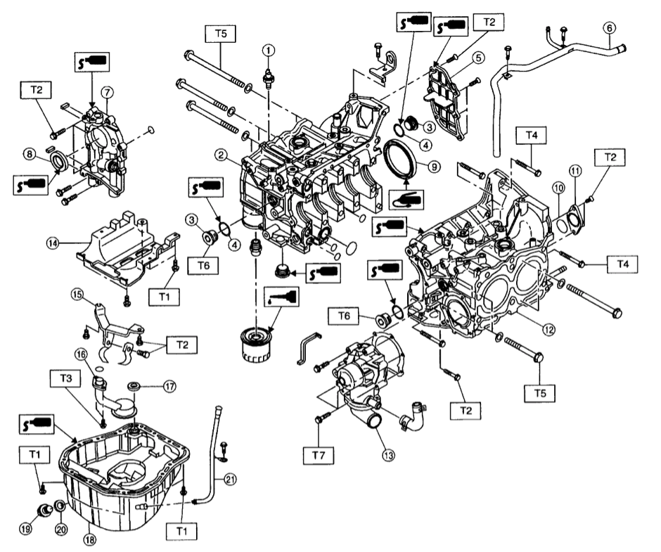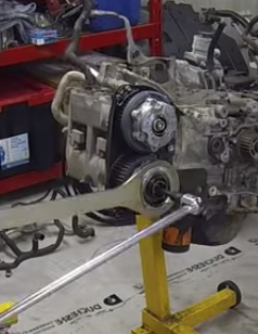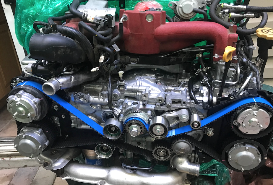 Assembly of a 2.5-liter 4-cylinder turbocharged boxer engine (EJ257) with Active Valve Control System (AVCS) manufactured by Fuji Heavy Industries.
