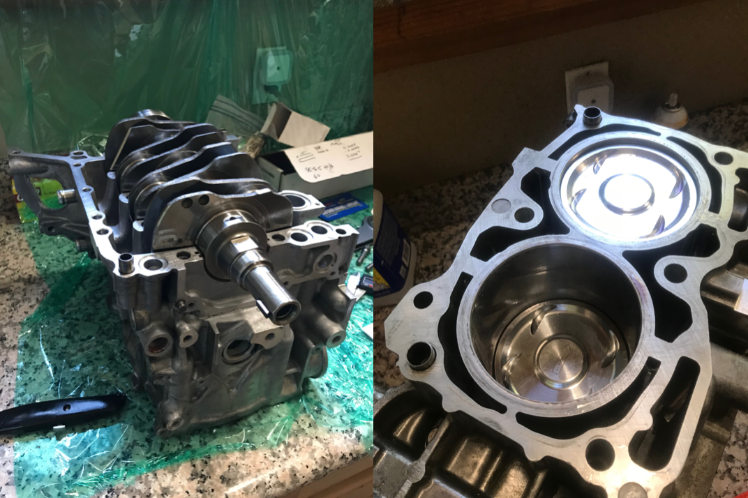 LEFT: Crankshaft is in the half-case, RIGHT: Pistons are in. Only 40h to go…
