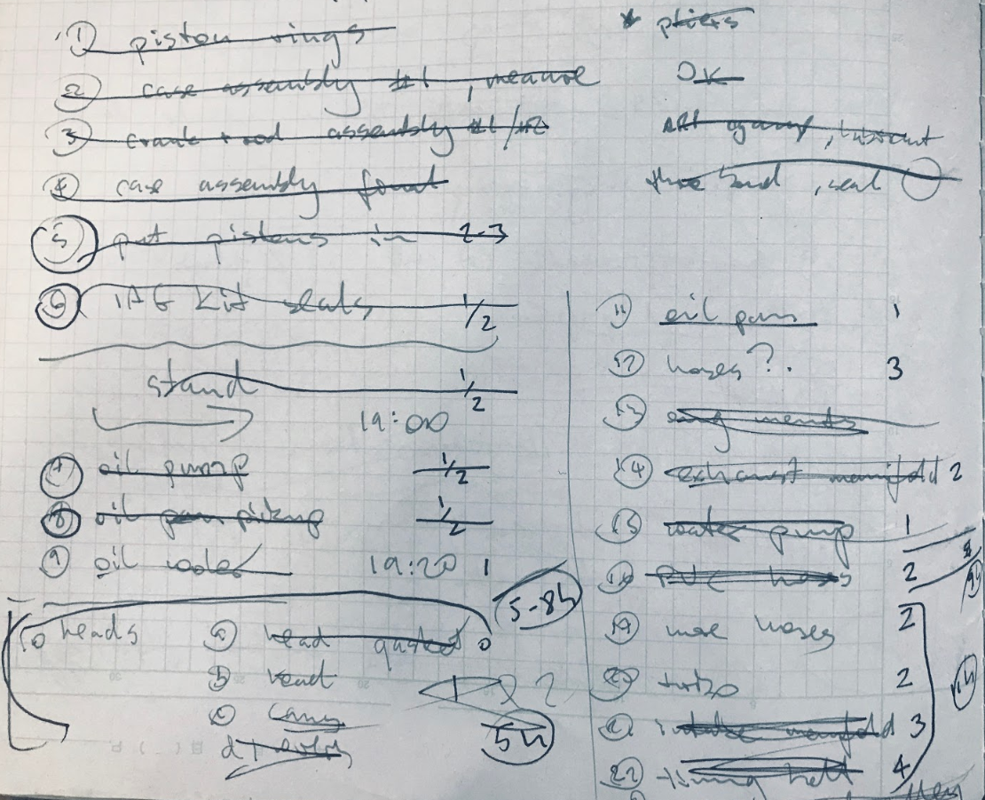 These are my notes for doing the assembly. You can see how I planned the order and estimated time in hours. Also, the are some references to the Youtube video (i.e. Oil Cooler 19:20 refers to that point in the video).
