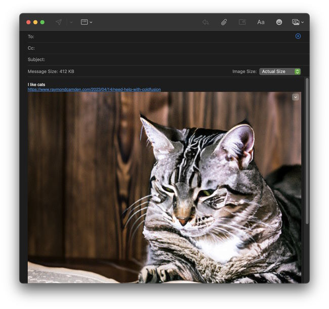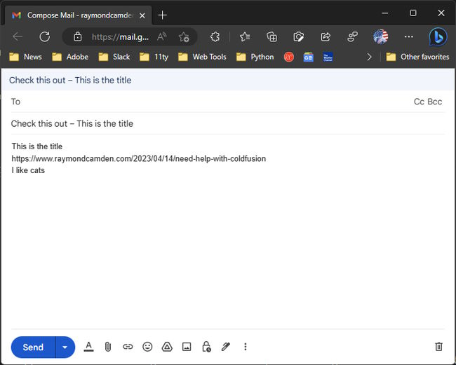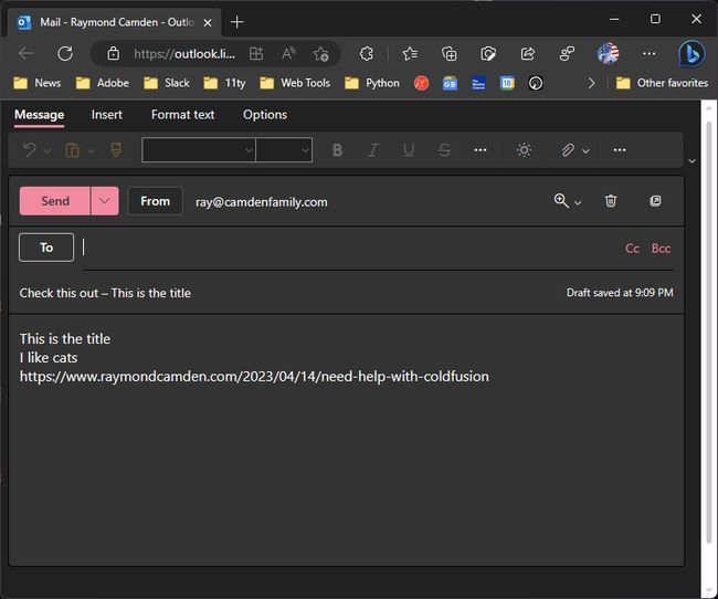 On the Mac, where again my options seem limited, it worked kinda. So for example, here's sharing to Mail from Safari: