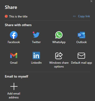 You'll also notice I'm just sharing text. That seems a bit unhelpful, but I try to start my experiments as simply as possible. So what happens when you click? I began my testing with Microsoft Edge, on desktop. After clicking, I get this UI in the top, center of my viewport: