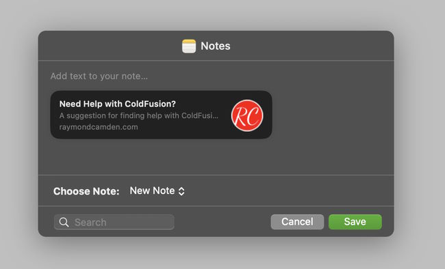 Note that it picked up the title of the URL and the favicon. If I select Notes, it disregards the title and text.