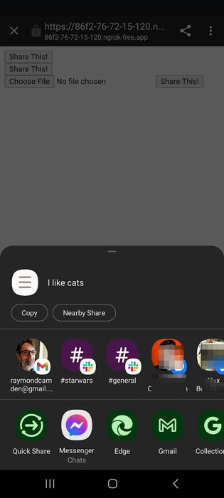 As an API, it's actually really simple. You have two methods, share and canShare. The purpose of canShare is to basically act as a validation for something you would pass to share, but in my testing, it returned true every time I found a way to make share fail, so I'm not sure it's actually useful now. (I'll show some examples later.)