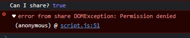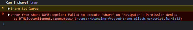 To make it fun, there are also rules on what types of files can be shared. MDN documents this, but if I test, canShare still returns true, and I get an error in the console; except this time, I don't get a warning with a nicer explanation. And I literally just noticed; this error is slightly different: