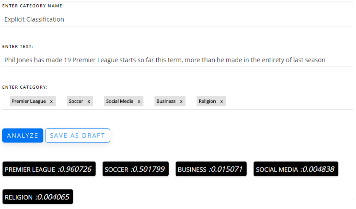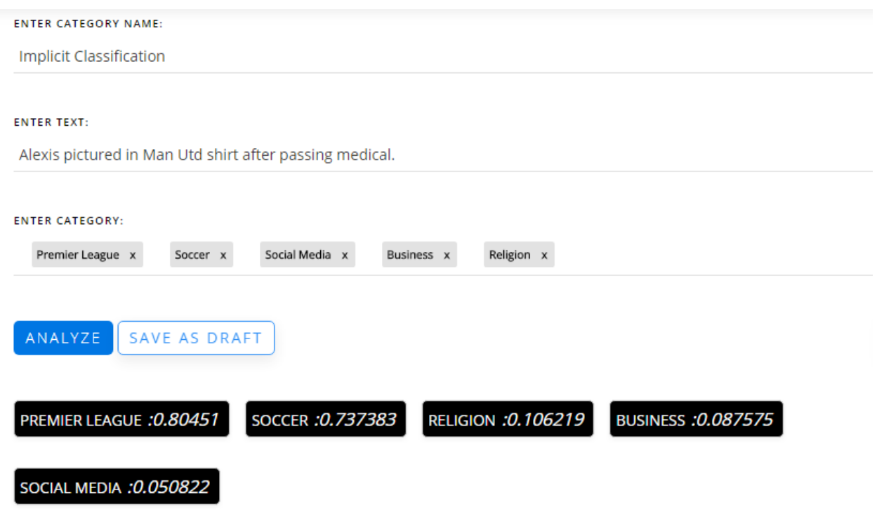 As we can see, this is among the first budding steps towards general AI. We did not mention anything related to Premier League or soccer but our Custom classifier could identify the relation. The very ability to do an implicit text classification over explicit text classification is what makes the Custom Classifier an amazing and useful tool.
