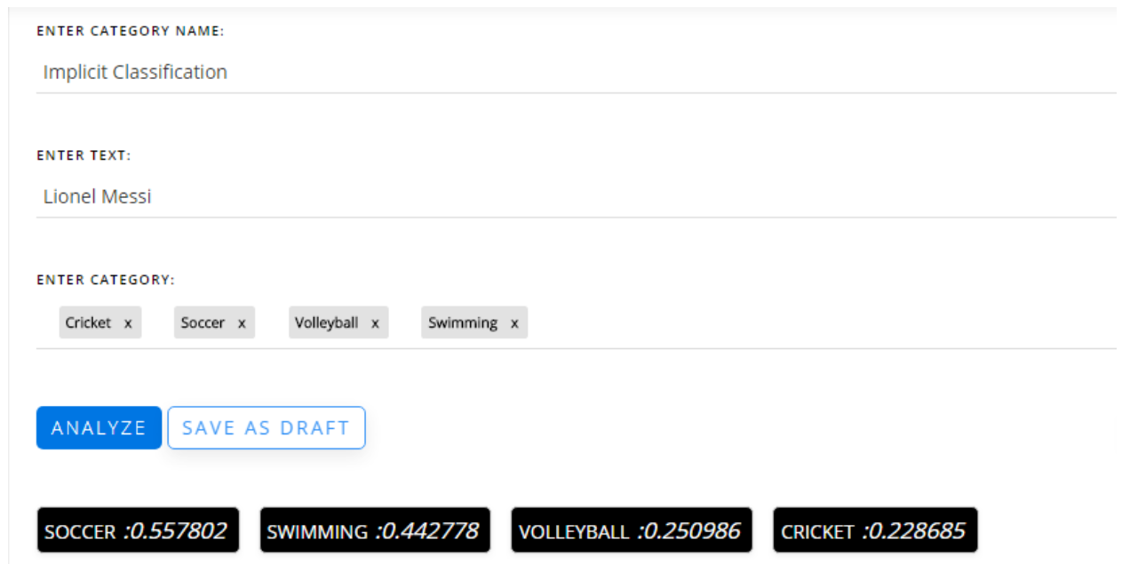 Custom classifier was able to classify that Lionel Messi is not just another name but also related to Soccer. This was an example of what is an implicit text classification wherein the input text there is no direct indication of or to the categories that it needs to be assigned to.