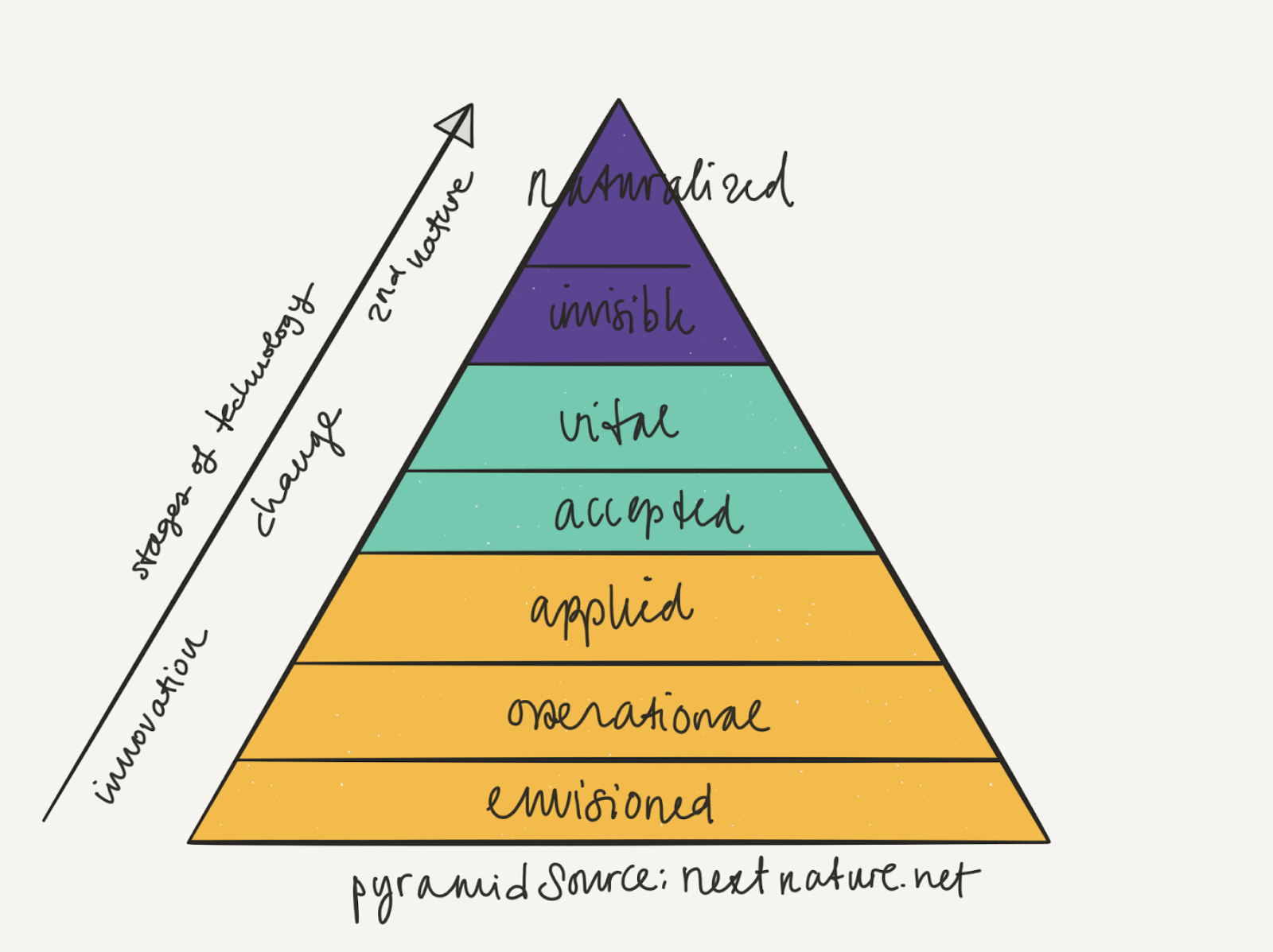 When we put the concepts of innovation and change next to the Pyramid of Technology, we could argue that a technology is in a phase of innovation in steps 1 through 3. Moving through stage 4 and 5 requires change. Until it has reached 6 and 7, when a technology has become second nature and we no longer see it as something new, or see it at all.