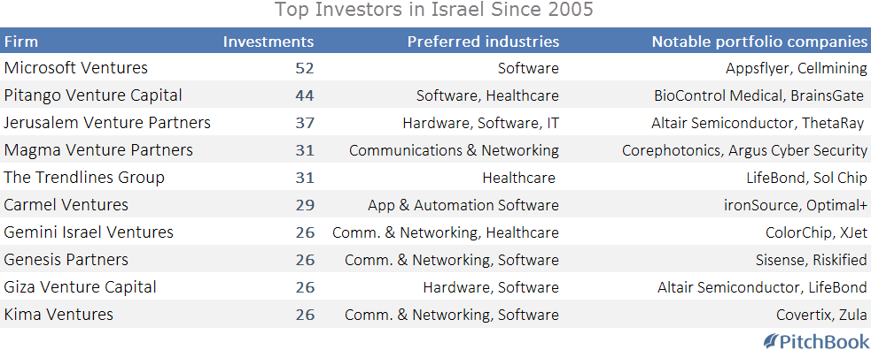 Total deal count declined slightly year-over-year, from 342 in 2014, but looking at the larger picture, investment in Israel is clearly on the rise. The average number of completed VC investments from 2013–2015 was 329, compared to 180 in the three years prior and 111 in the three-year period before that. While some foreign firms such as Sequoia and Microsoft Ventures are pumping money into Israel, there’s also no shortage of domestic investors supporting the booming industry, including Pitango Venture Capital, Jerusalem Venture Partners and Carmel Ventures, all of which rank in the top 10 most-active Israeli investors in the past decade.
