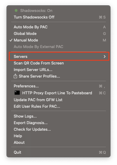 - Manual mode: In this mode, ShadowsocksX-NG starts the proxy server, but doesn't set any network system preferences. This gives you the flexibility to set the network system preferences yourself, or set preferences for specific applications to use the Shadowsocks proxy. Essentially, this mode allows selective routing of network traffic through the Shadowsocks Server.