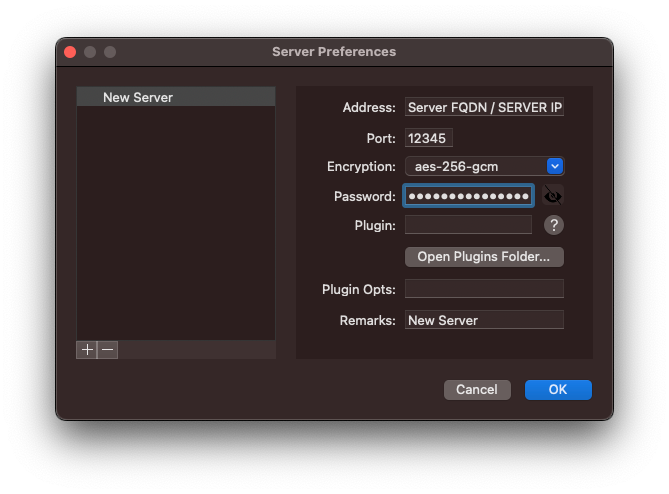 - Fill in the Server FQDN or Server IP, Server Port, Password, and Encryption method as per your Shadowsocks server configuration.