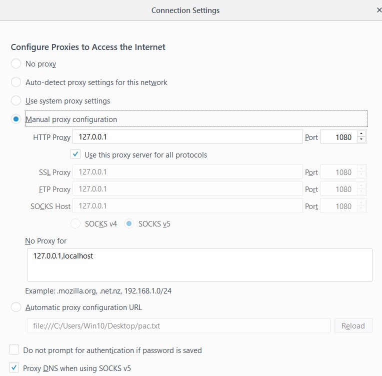 - Go to your web browsers proxy settings (Firefox proxy settings are shown below). Set your settings to be like below. Now all your browser traffic will be going via the ShadowSocks Server.