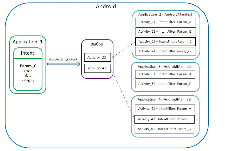The Intent parameter is created inside the first application (Application 1). There, we prescribe the categories of action, data, and category. Then, using startActivity, we start the search for the desired Activity.