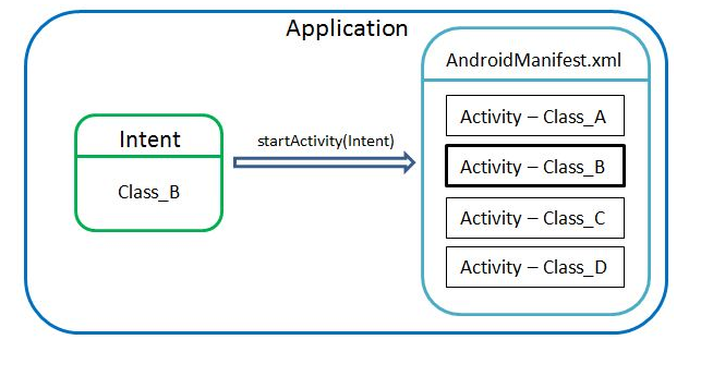 We create an Intent variable in the parameter of which Activity – Class_B is written. After that, we start the startActivity method with the added Intent. The program automatically finds an Activity with the Class_B parameter in the manifest file. If such a variable does not exist, we'll see an error. Otherwise, everything works. The whole process takes place inside one program.