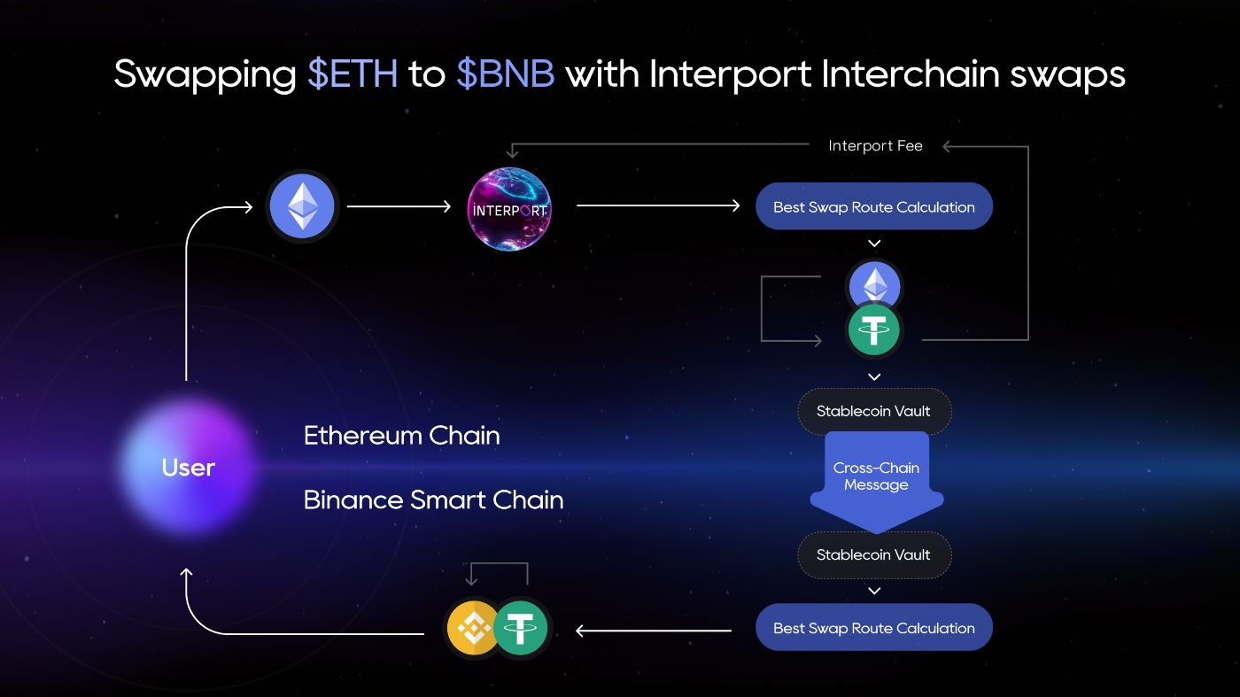 Concurrently, a cross-chain call is made to the contract on the destination chain with execution parameters. The contract on the destination chain then accesses stablecoins from the Interport liquidity pool, performs swaps, and sends the desired tokens to the user on the target chain.