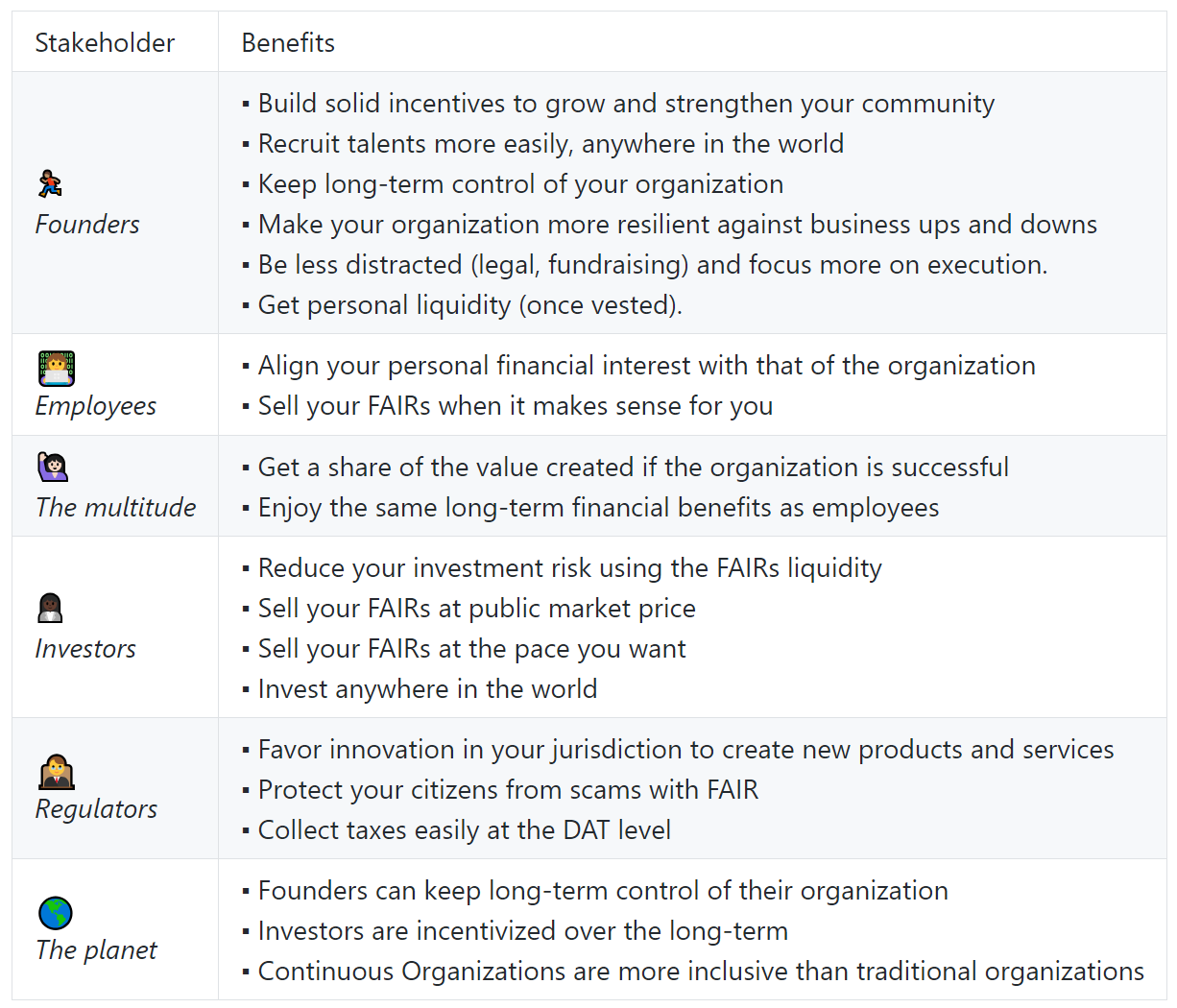 TL;DR Aligning stakeholders’ interests in an organization is hard. The current fundraising models (ICO or private fundraising) impose significant limitations on the mechanisms available to align stakeholders’ interests. A Continuous Organization (CO) is a new model designed to make organizations more fluid and more robust by overcoming those limitations. Using the Continuous Organization model, organizations can set themselves in continuous fundraising mode while benefiting from solid and flexible mechanisms to align stakeholders’ interests in their financial success. A detailed (ICO-less!) white paper is available here.