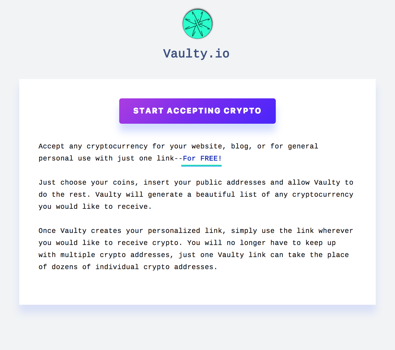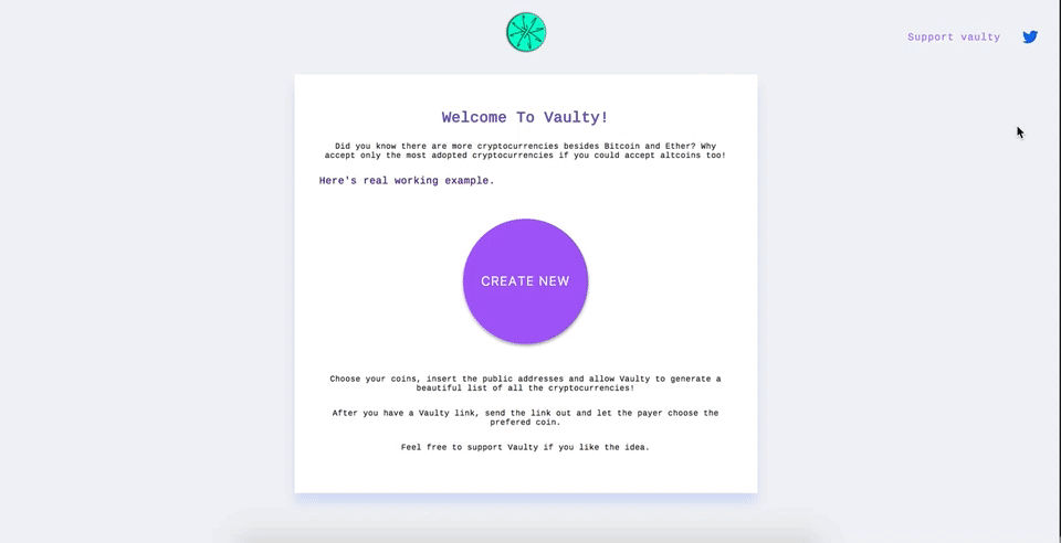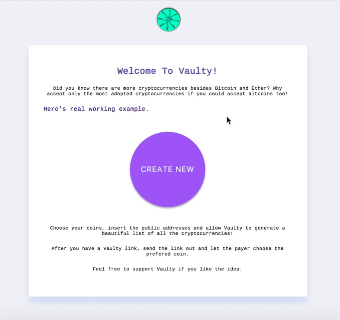 Vaulty is a great way to give love to the altcoins. And I’m giving it all away, for free. I rely 100% on donations made. I have no plans to monetize Vaulty.