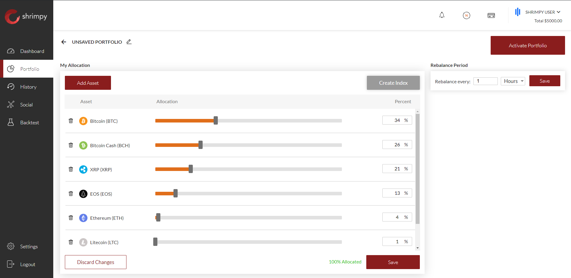 By focusing on ease of use for new cryptocurrency users, Shrimpy will change the way people manage their cryptocurrencies. The end vision for our application is one where you can deposit fiat currencies directly onto our platform, allocate a diverse portfolio in minutes, and monitor every aspect of your portfolio in real time. All of this will be baked directly into the Shrimpy platform, so there is never a need to use third party tools that require significant amounts of work to maintain.