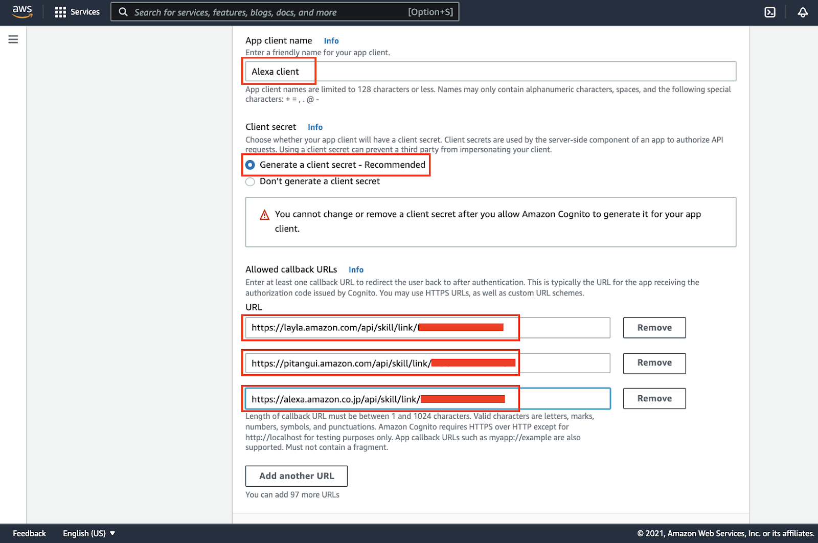 Now you need to copy callback URLs from Alexa Developer Console and insert them into the provided fields.
