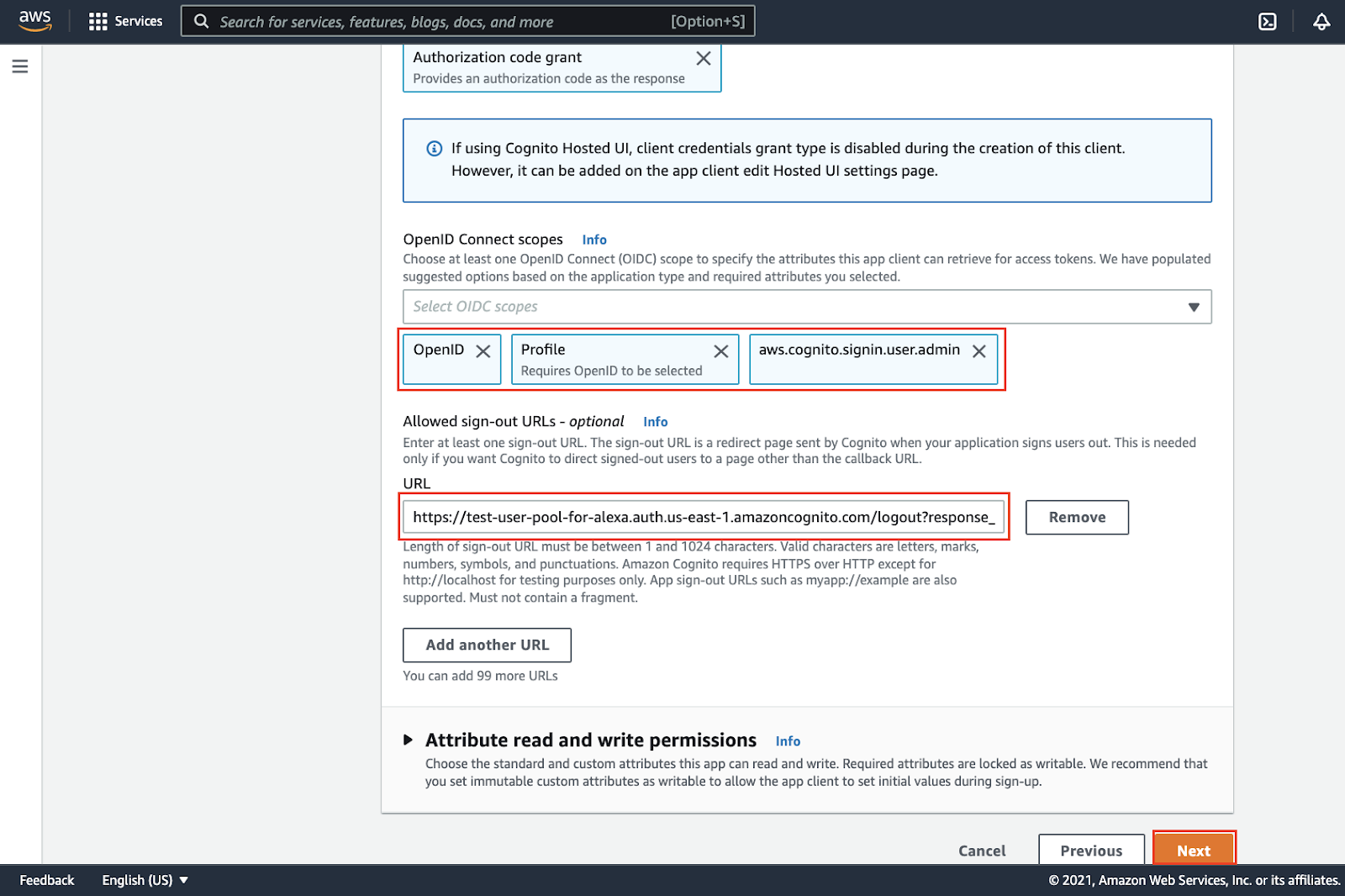 - Access Token URI: https://{YOUR_DOMAIN}.auth.us-east-2.amazoncognito.com/oauth2/token