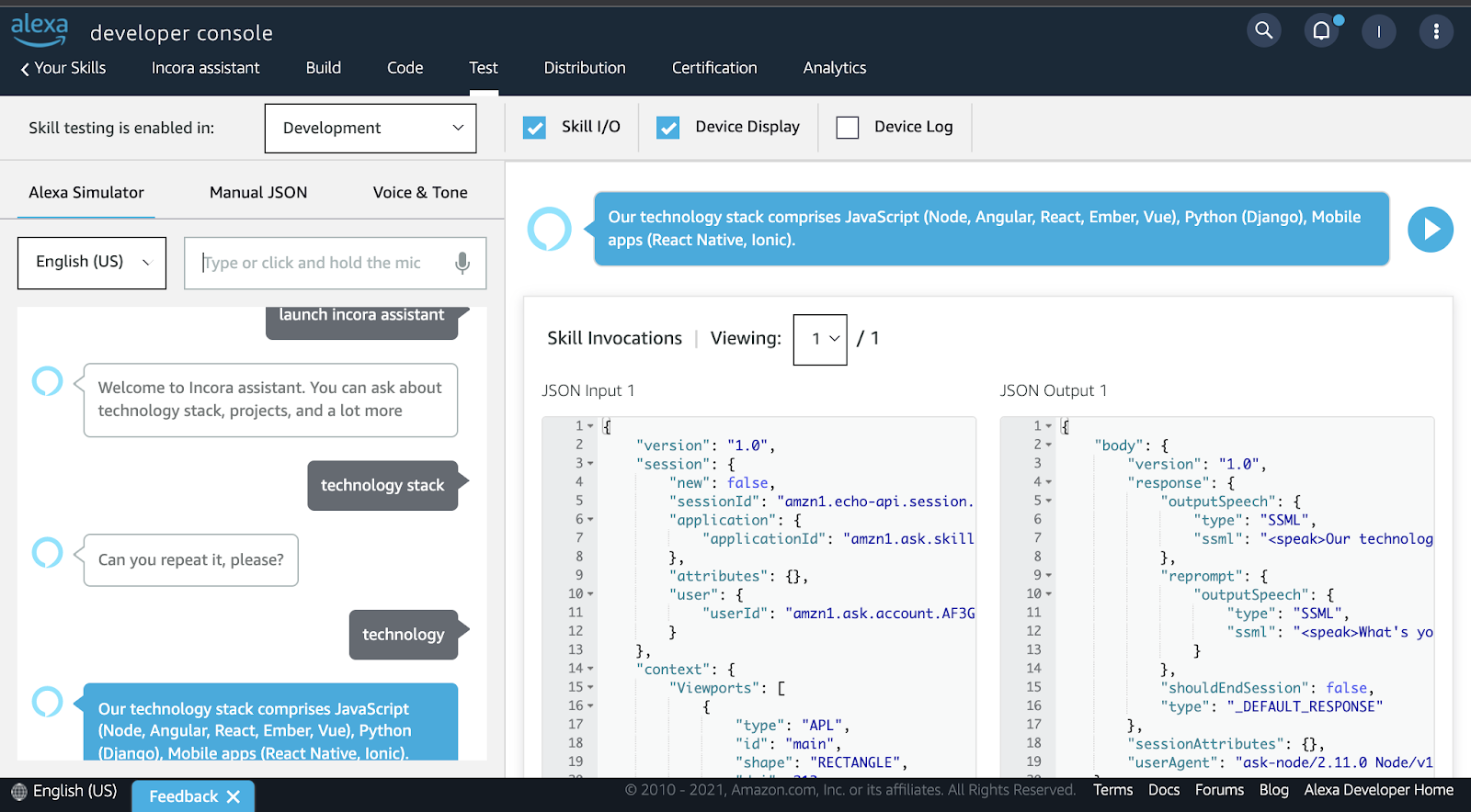 Finally, your skill is built, and you can try to test it using the Alexa developer console or any Alexa device. Don’t forget to switch to development mode in ‘Test’ inside the navigation bar.