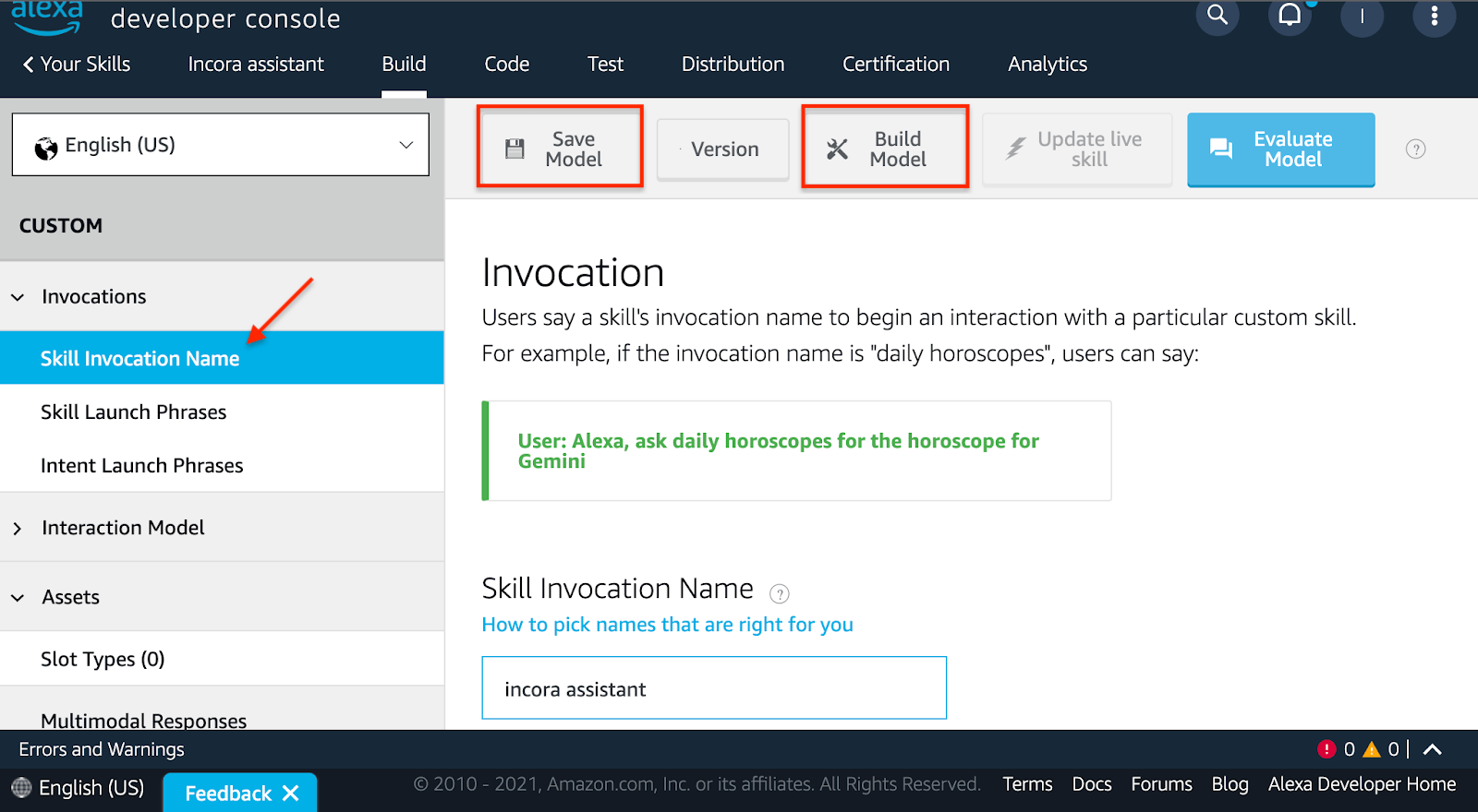 First of all, you need to create an Amazon account on Alexa. After that, you can go to Developer Console and start creating your first Alexa skill. To do so, you need to decide on the skill name. The skill name could be everything, however, the creation implies to make it customized and unique, so there is no plagiarism on the market. For the example, we chose ‘Incora assistant’.