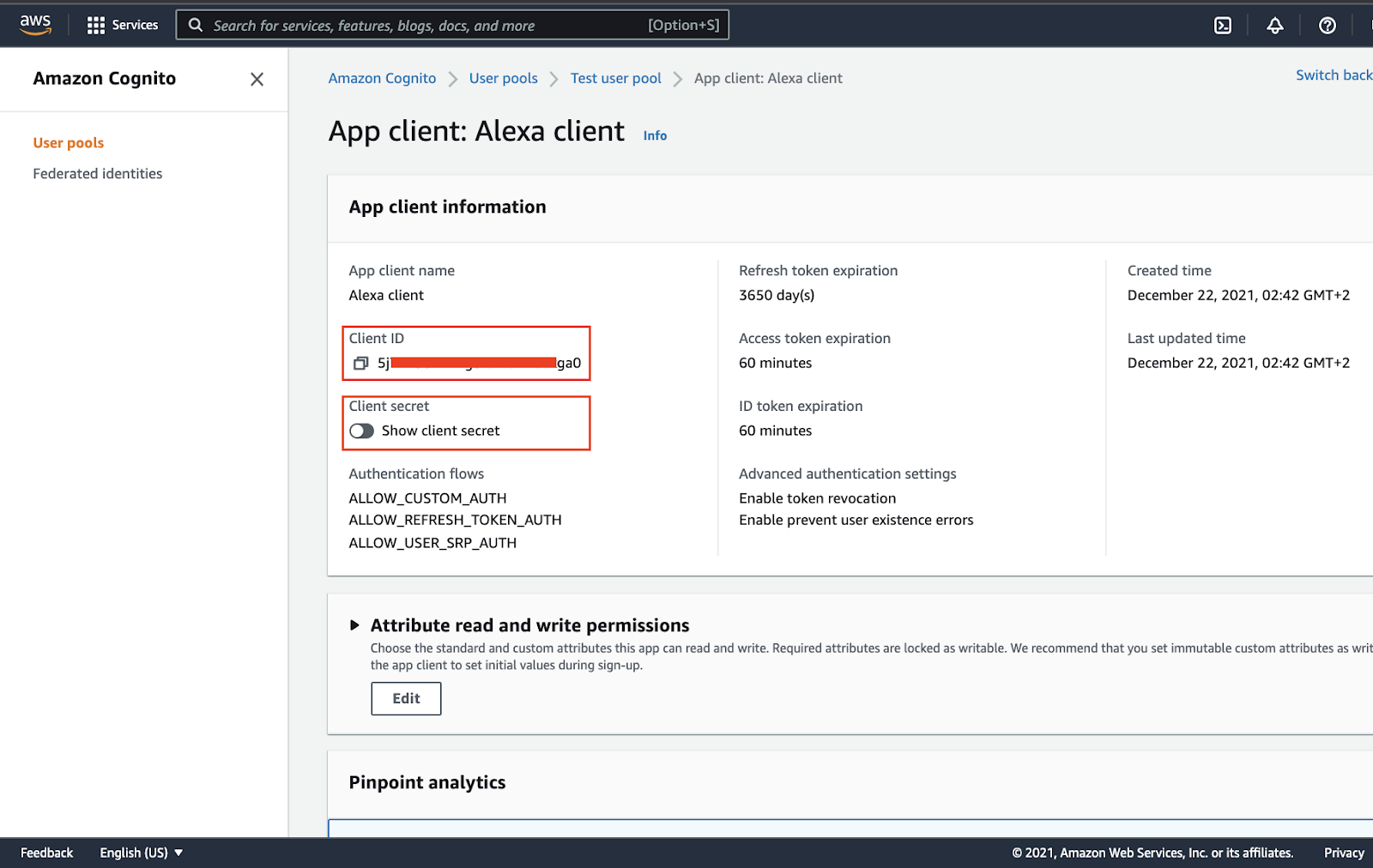 All the steps above lead to the formation of the client id and secret id. So, you copy that data from the tab ‘Test User Pool → App client: Alexa client’.