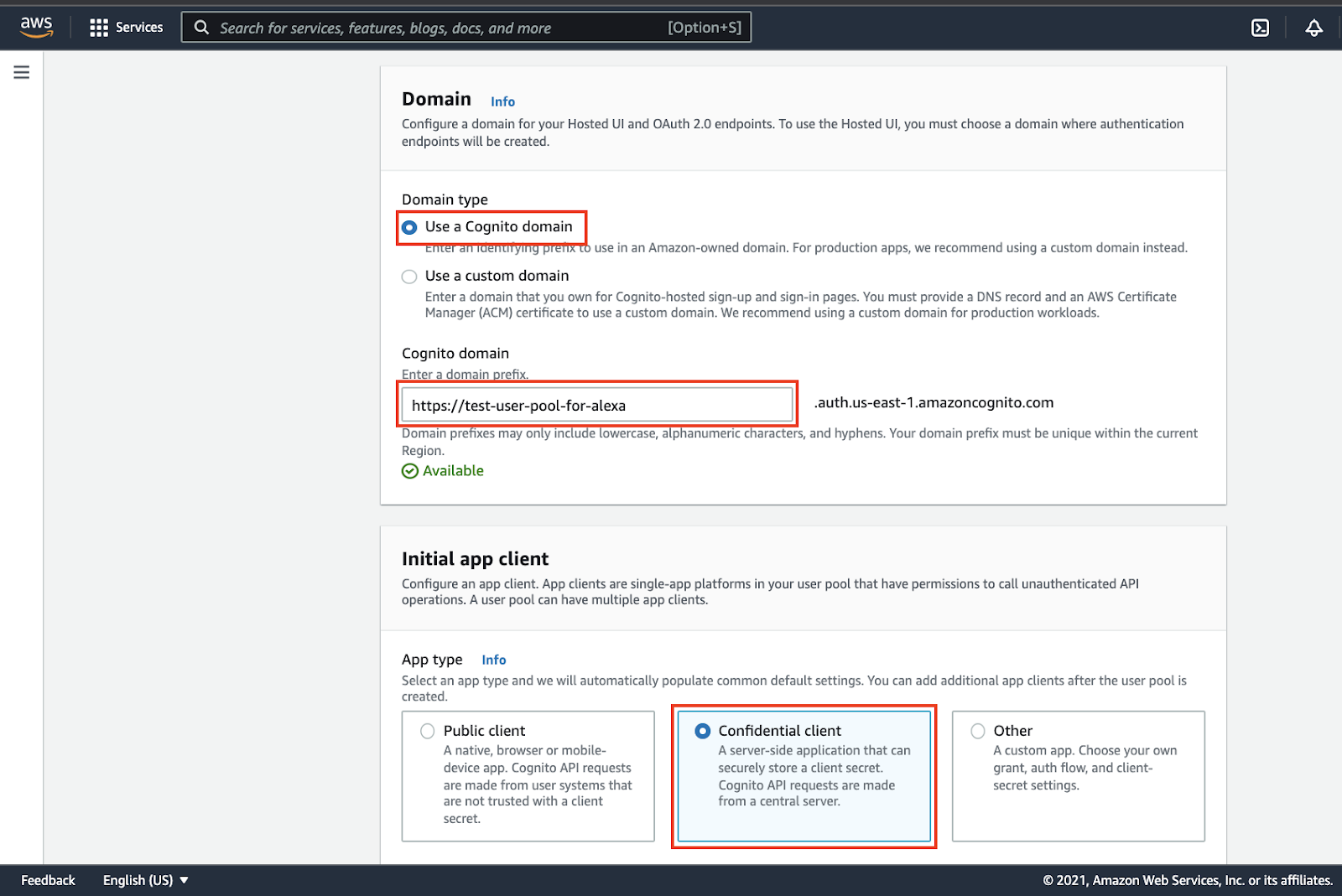 For the next step, you need to have an existing AWS Cognito User Pool or create a new one and set it up. To do so, move onto the AWS Cognito page. There we will set up User Pools in order to get the client id and secret id, which will be needed for the further configuration on the Alexa Developer Console.