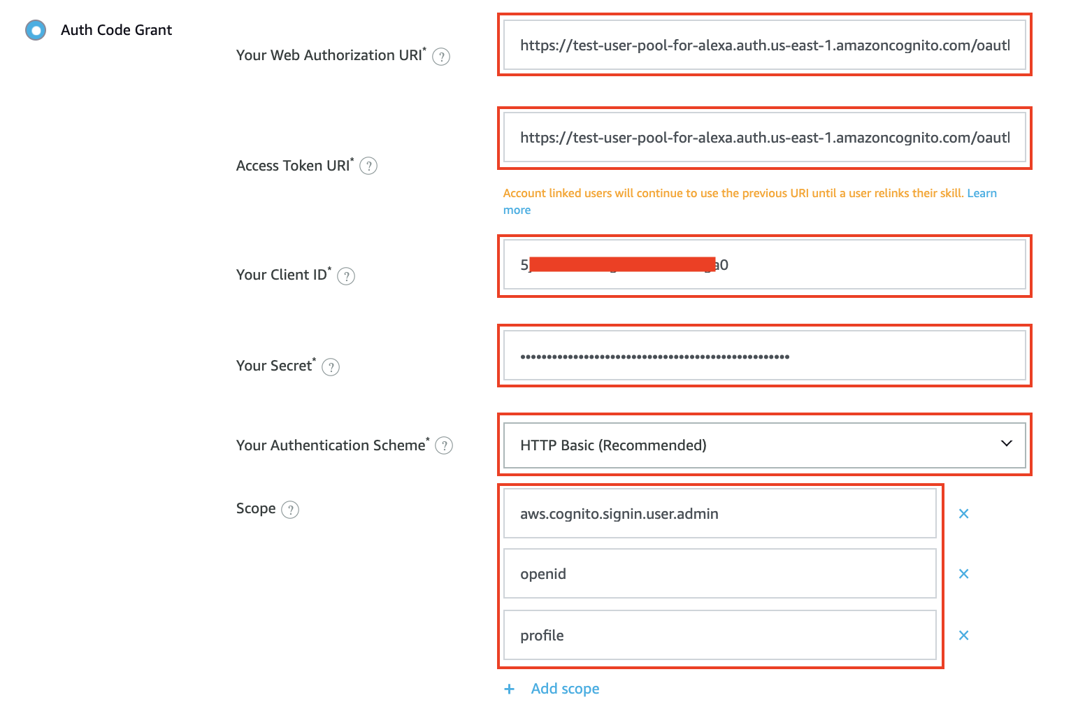 - Web Authorization URI: https://{YOUR_DOMAIN}.auth.us-east-2.amazoncognito.com/oauth2/authorize?response_type=code&redirect_uri=https://pitangui.amazon.com/api/skill/link/{CODE}