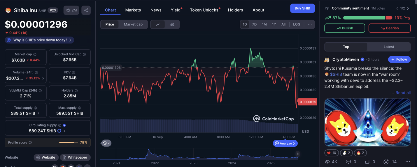 Currently, Shiba Inu (SHIB) sits near short-term support around $0.00001296, with resistance overhead. Volume is thin and order books lack depth. A sudden wave of buys could hold SHIB above support, while heavy selling could push it down. Traders are watching exchange inflows and whale activity closely for breakout signs. In short, the outlook is cautious SHIB needs a rapid pickup in volume.